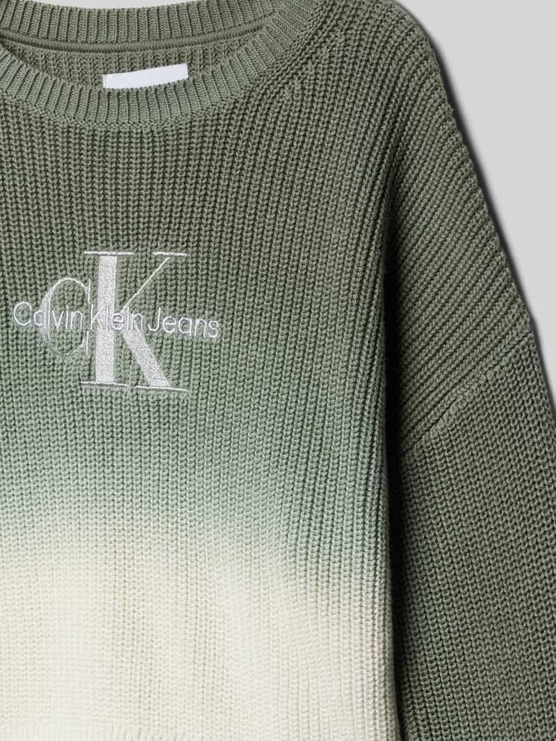 Gebreide kinderpullover van Calvin Klein Jeans. Puur katoen. Los model. Ronde hals. Labelstitching. Ribboorden. Ruglengte bij maat 140: 36 cm. Mouwlengte bij maat 140: 46 cm
