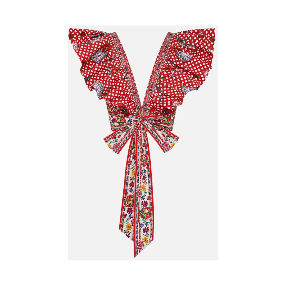 Vang de essentie van Portugese folklore met The Faith, Luck & Justice Ruffle Wrap Top van Camilla. Met liefde met de hand gemaakt, deze top heeft een aansluitend lijfje, chique cropped lengte, volumineus ruchedetail en een speels maar elegant wrap-front ontwerp. Versierd met kristallen versieringen en delicaat borduurwerk, toont het Barcelos Cockerel en vismotieven tussen kleurrijke bloemen. Gemaakt van 100% katoen.