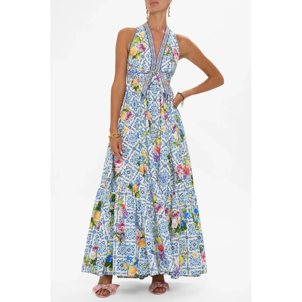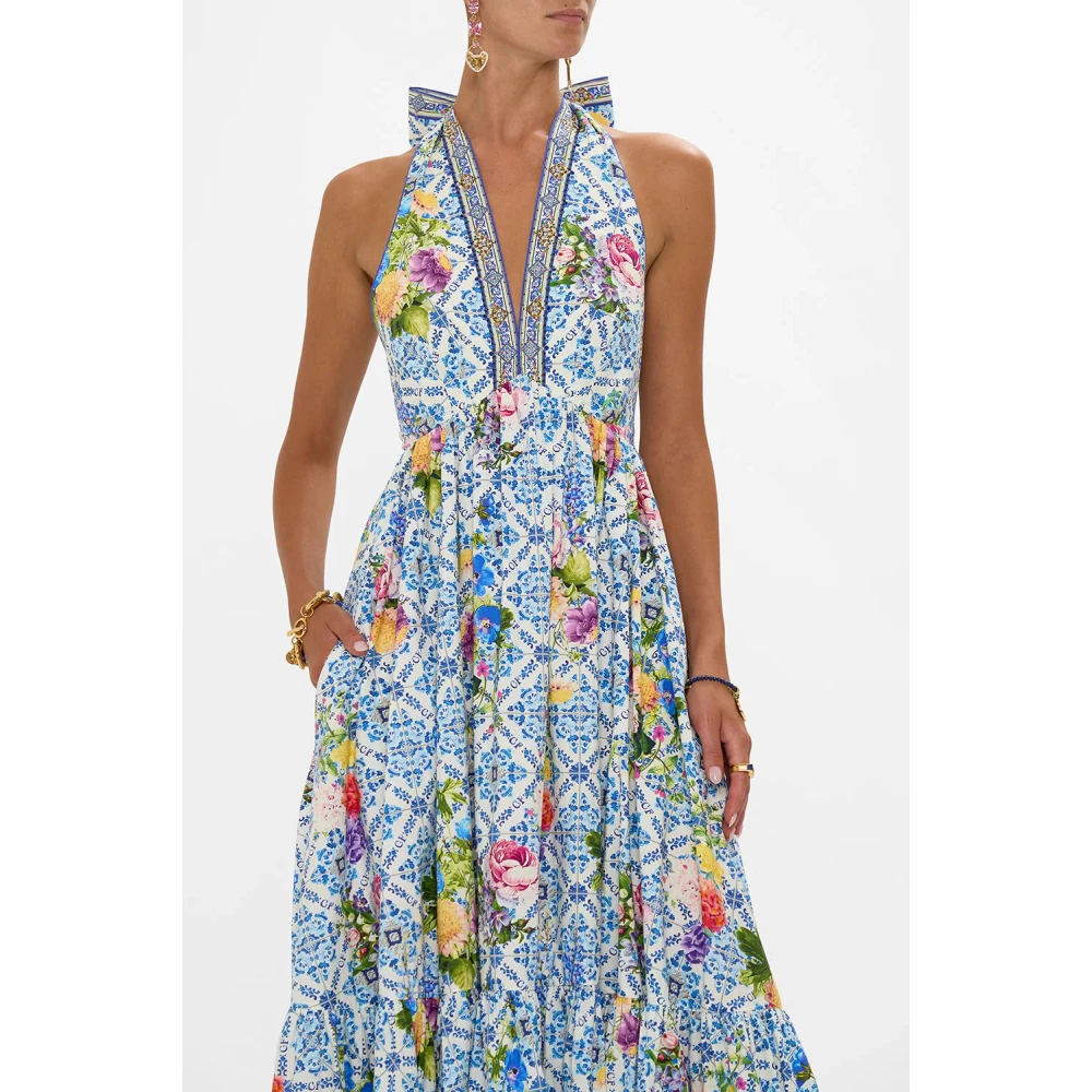 Vang de grootsheid van Queluz Palace met de Wall To Wall Wonders Ruffle Hem Halter Dress van Camilla. Met de hand vervaardigd in Australi, deze halterjurk heeft zachte blauwe en gouden gele tinten genspireerd op Azulejo tegels, die geschiedenis en kunst mengen in een panoramisch beeld van de tijdloze schoonheid van Portugal. De volle rok valt moeiteloos, terwijl de verstelbare halterband en lage rug allure toevoegen. Schitterende kristallen versieringen en een speelse ruche zoom brengen een vleugje van Camilla's kenmerkende charme. Aansluitend lijfje, volledige lengte rok, centrale achterritssluiting, niet doorschijnend. Gemaakt van 100% katoen. Ontworpen op maat.