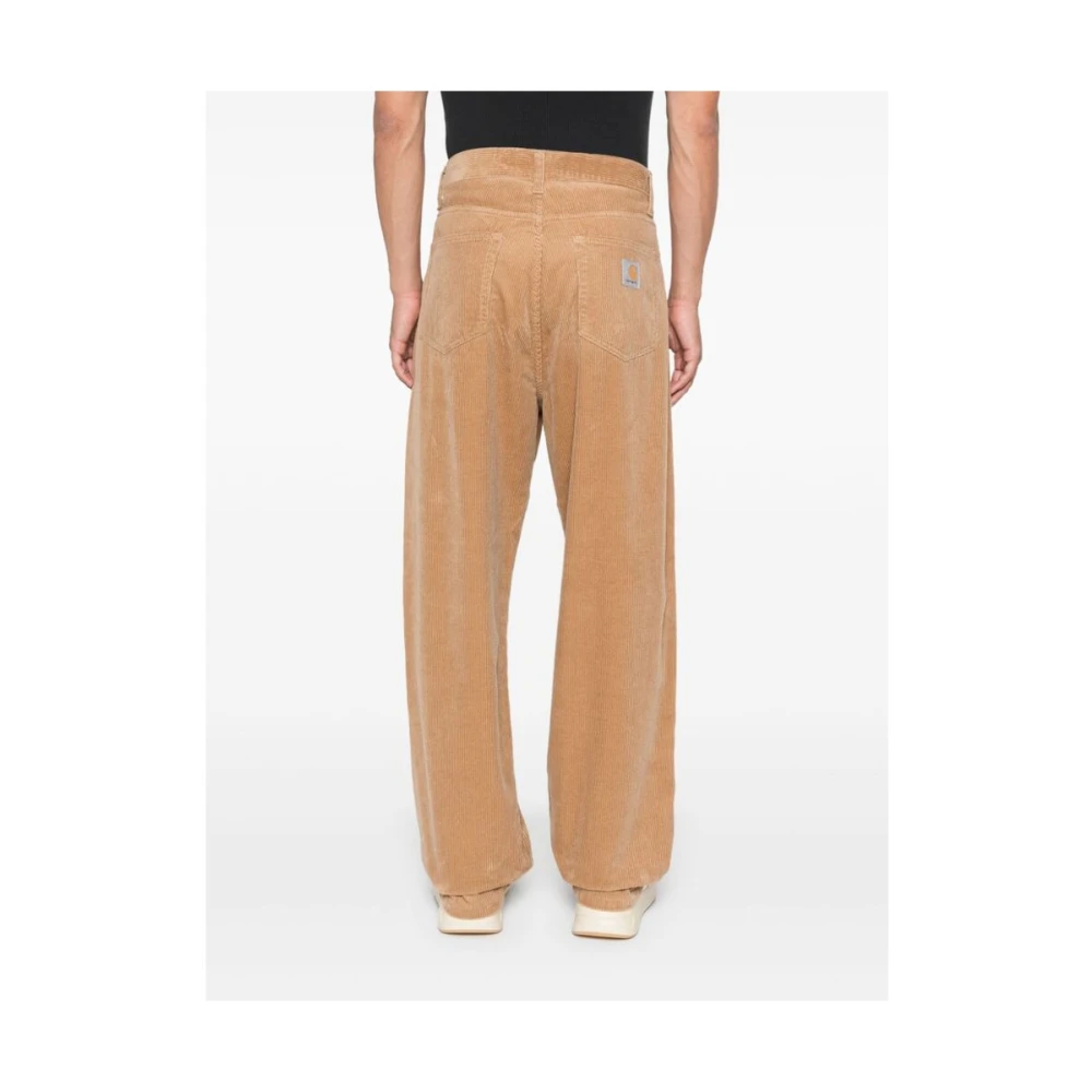 Carhartt Wip lichtbruine katoenen ribfluwelen wijde broek voor heren. Voorzien van riemlussen, klassieke vijf zakken, logopatch op de achterkant, toelopende pijpen en knoopsluiting met rits aan de voorkant.
