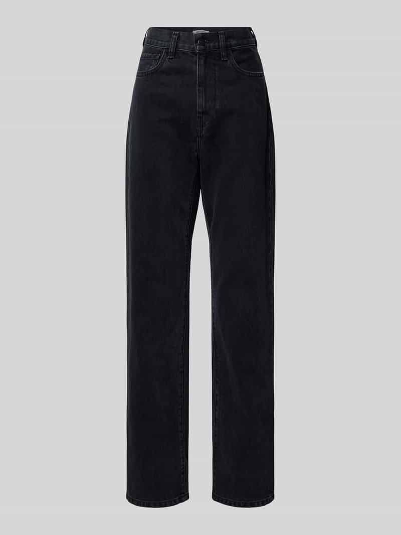 Damesjeans van Carhartt Work In Progress. Rechte pijpen. High waist. Model 'Noxon'. Riemlussen. Bandwijdte bij maat 27: 36 cm. Binnenbeenlengte bij maat 27: 79 cm