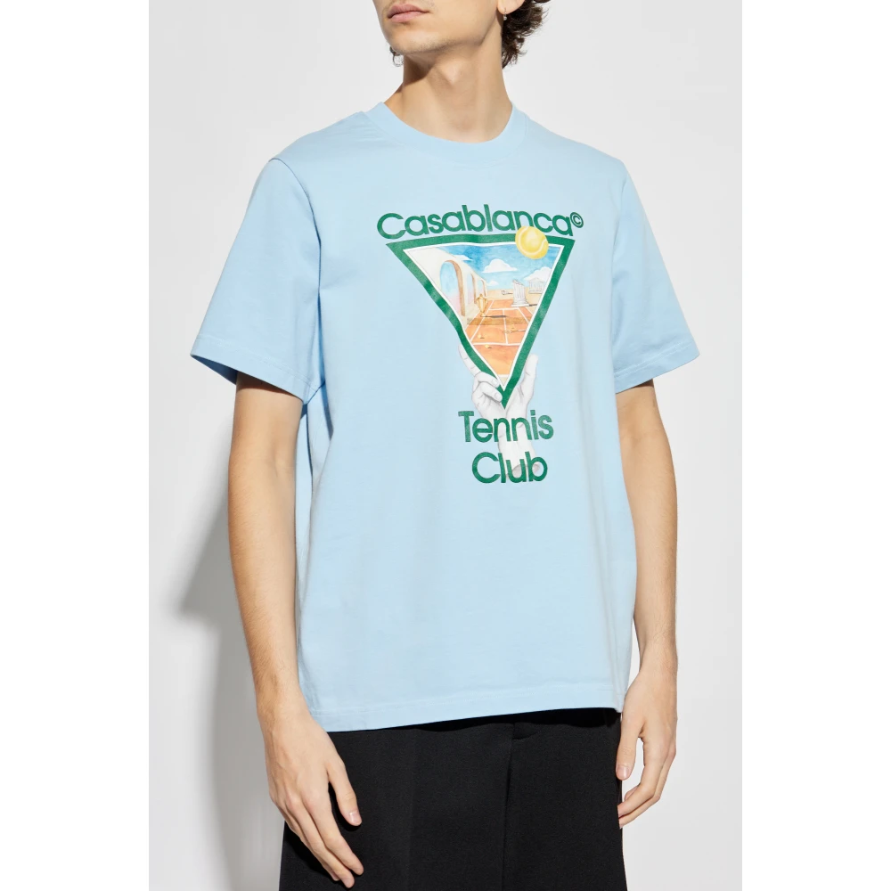 Maak kennis met het Gedrukte T-Shirt uit de exclusieve collectie van het Parijse merk Casablanca, opgericht door Charaf Tajer. Dit klassieke lichtblauwe T-shirt combineert eenvoud en elegantie, waardoor het de perfecte keuze is voor alledaagse outfits met een vleugje luxe. Gemaakt van zacht katoen biedt het uitzonderlijk draagcomfort. De voorkant van het shirt heeft een opvallende, kleurrijke print met de inscriptie