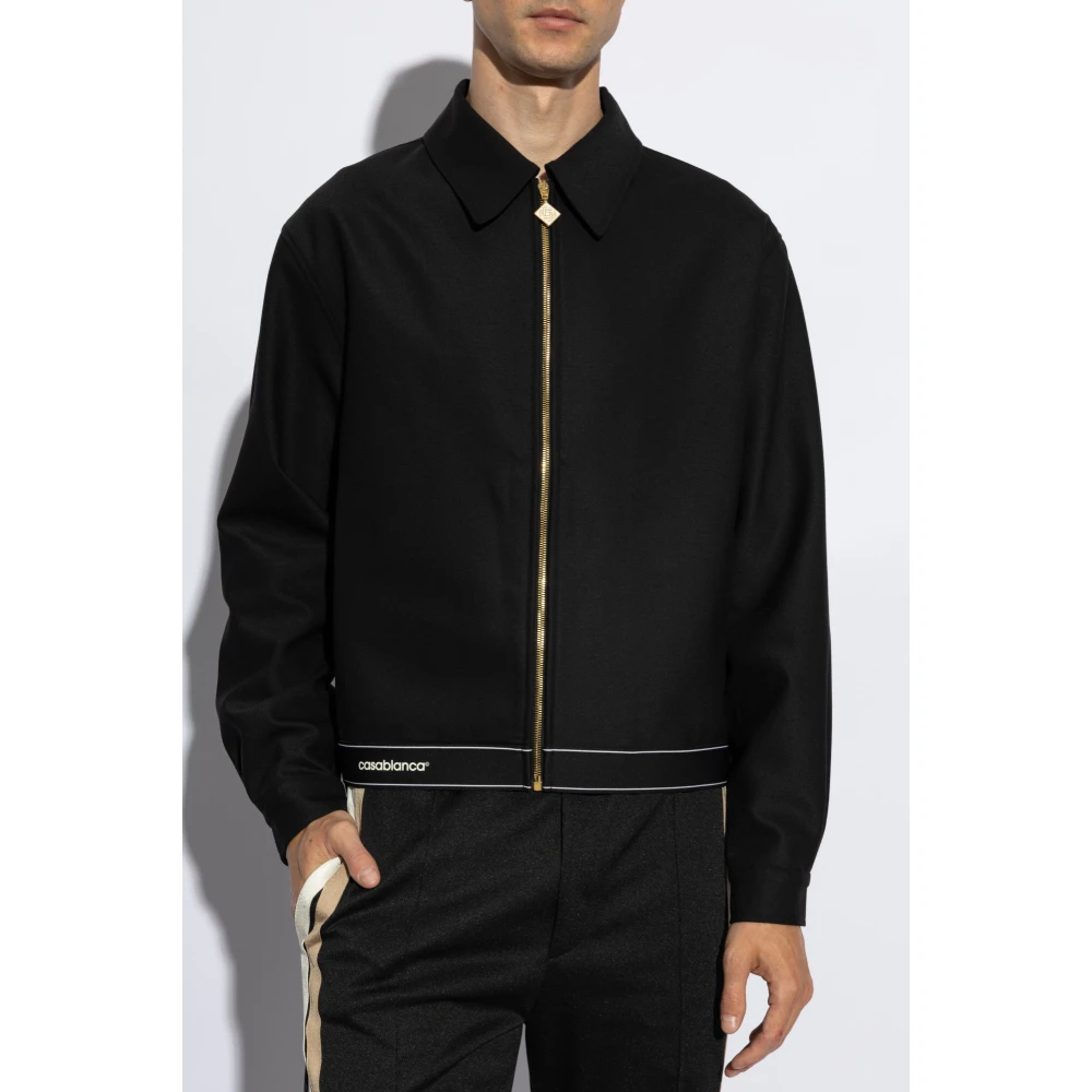 Upgrade je stijl met de Casablanca Black Sport Tailoring Jacket voor heren. Gemaakt van een premium wolblend stof, deze zwarte jas heeft een puntkraag, een ritssluiting aan de voorkant met het kenmerkende diamanten logo en goudkleurige knoopsluitingen op de manchetten. Blijf stijlvol en verfijnd met dit veelzijdige stuk.