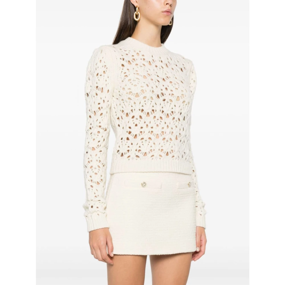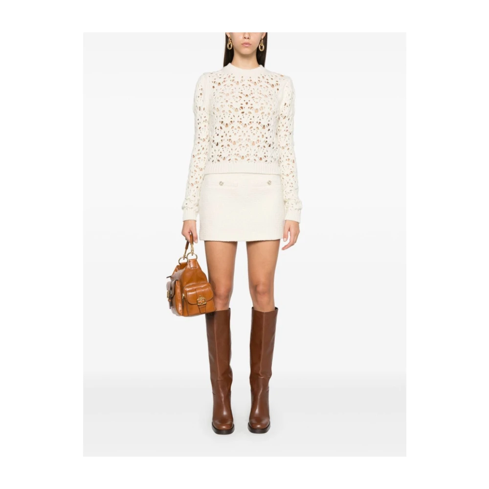 Upgrade je stijl met de ivoorkleurige chunky pointelle wollen trui van Chlo. Dit vrouwelijke stuk heeft een ronde hals, lange pofmouwen, geribbelde randen en een rechte zoom, perfect voor de modebewuste vrouw.