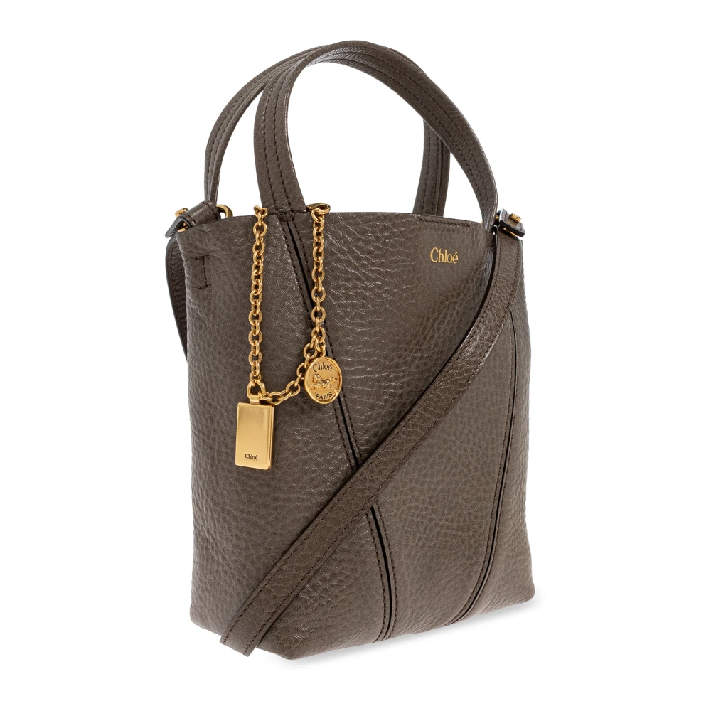 Maak kennis met de uitzonderlijke Spin Small handtas van Chlo, die elegantie en functionaliteit combineert. Gemaakt van het hoogste kwaliteitsleer, heeft het een kenmerkende textuur en een elegante bruine tint. De klassieke emmervorm met afgeronde zijden benadrukt het tijdloze ontwerp. De voorkant van de tas toont een goud
