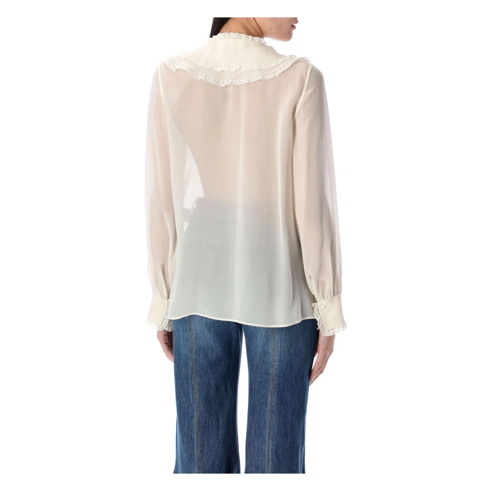Upgrade je garderobe met deze luxueuze Dusty White Silk Ruffled Blouse van Chlo. Gemaakt van 100% zijde, met prachtige kanten afwerking en plooitjes. Perfect voor elke gelegenheid, deze blouse combineert elegantie met comfort. Een must-have item! Zijden georgette stof, knoopsluiting aan de voorkant, geschulpte bloemenkant aan de voorflensen en manchetten, plooitjes aan de voorkant, strikken afgewerkt met goudkleurige metalen uiteinden. Model is 1, 70 m en draagt maat 36.