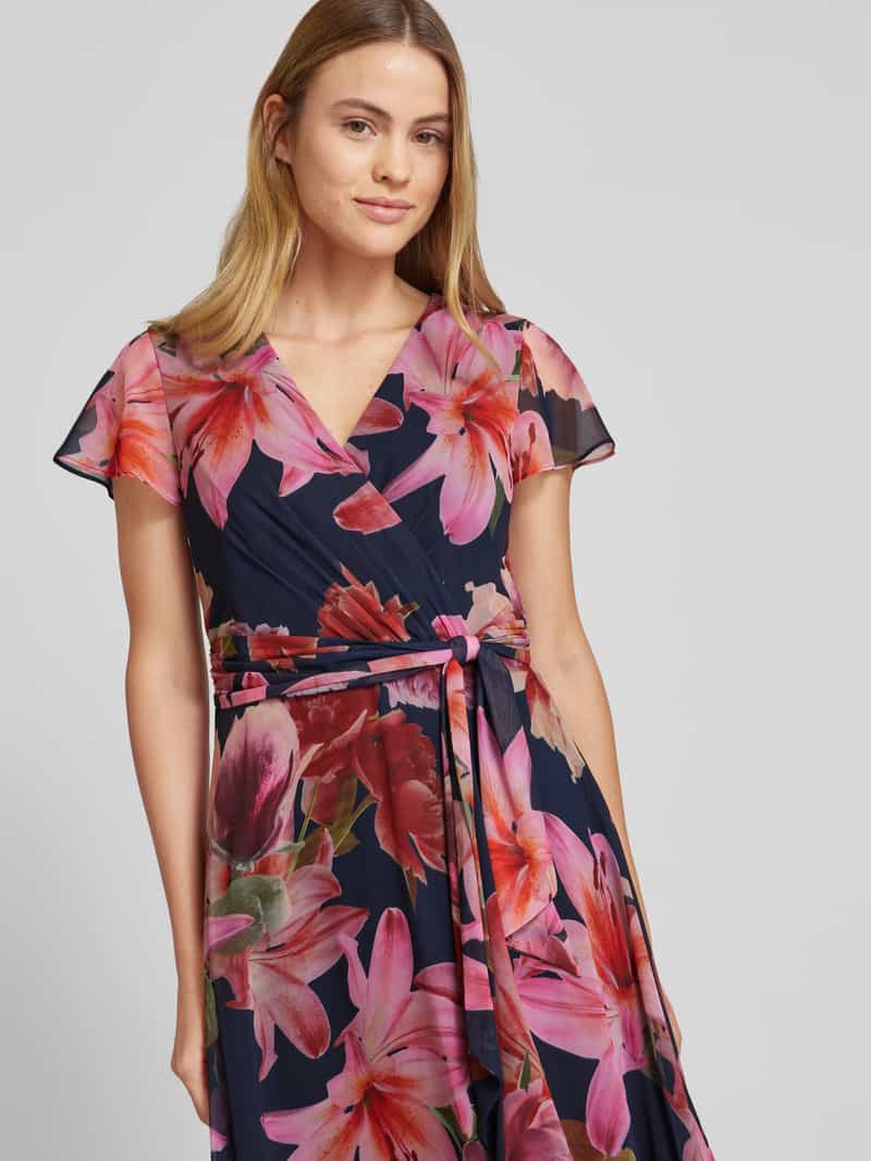 Avondjurk voor dames van Christian Berg Cocktail. Chiffon. Getailleerd model. Maxi-jurk. All-over print. V-hals. Wikkellook. Strikceintuur. Ruglengte bij maat 36: 170 cm. Borstomvang bij maat 36: 37 cm. Mouwlengte bij maat 36: 15 cm
