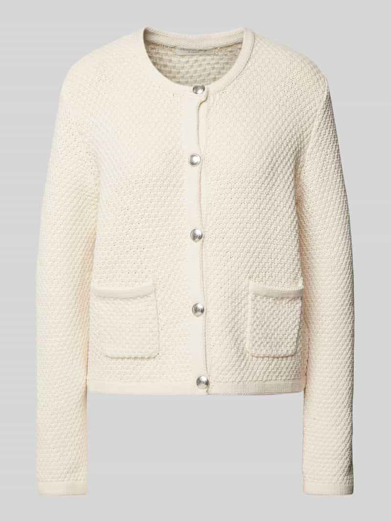 Damescardigan van Christian Berg Woman. Katoenmix. Recht model. Ronde hals. Doorknoopsluiting. Structuurpatroon. Opgestikte zakken. Ruglengte bij maat S: 48 cm. Mouwlengte bij maat S: 72 cm