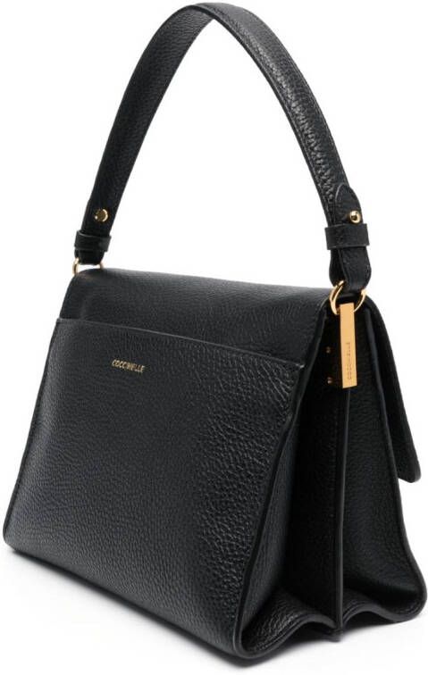 Zwart, kalfsleer, bewerkte textuur, logopatch aan de binnenkant, goudkleurig logo, omslag, binnenvak met ritssluiting, enkel plat handvat, afneembare en verstelbare schouderband en gepartitioneerd compartiment.