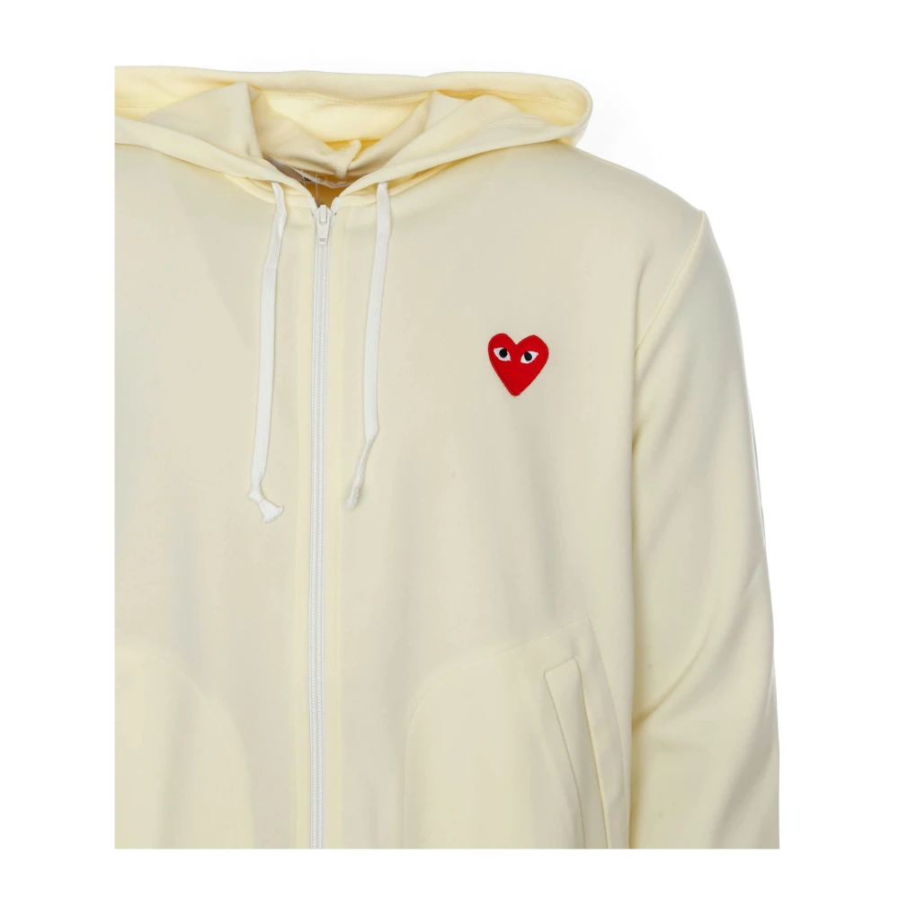 Upgrade je casual garderobe met deze Comme des Garons Play zip-through sweatshirt voor mannen. Met een capuchon met trekkoord, zijzakken, elastische manchetten en een logo-patch op de linkerborst, is deze heuplange sweatshirt gemaakt in Japan voor een stijlvolle en comfortabele pasvorm.