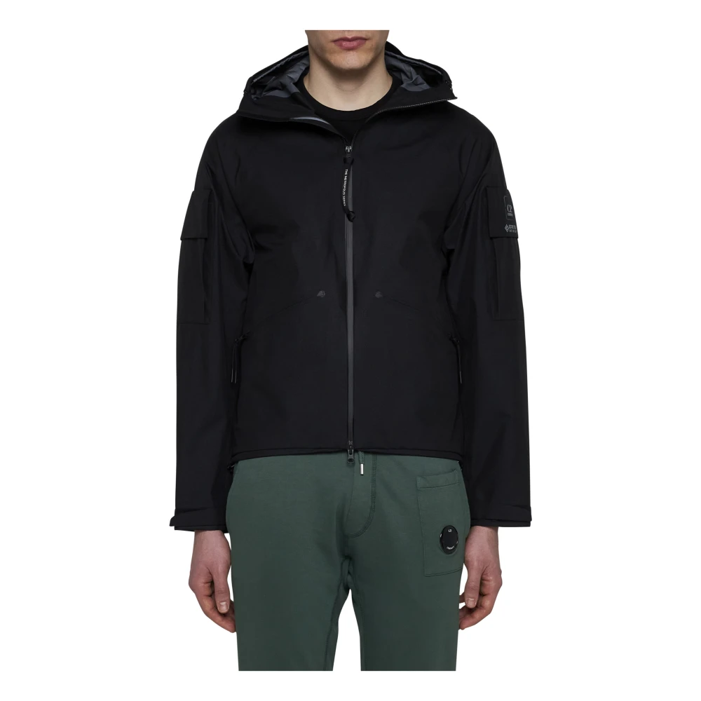 Upgrade je stijl met deze zwarte lichtgewicht jas van C.p. Company. Gemaakt van waterdicht Gore-Tex materiaal, heeft het een klassieke kraag, lange mouwen, mouwzak, logoprint op de mouw, twee zijzakken met ritssluiting, intern logolabel, aantrekkoord in de zoom en tweewegritssluiting aan de voorkant. Perfect voor de moderne man.