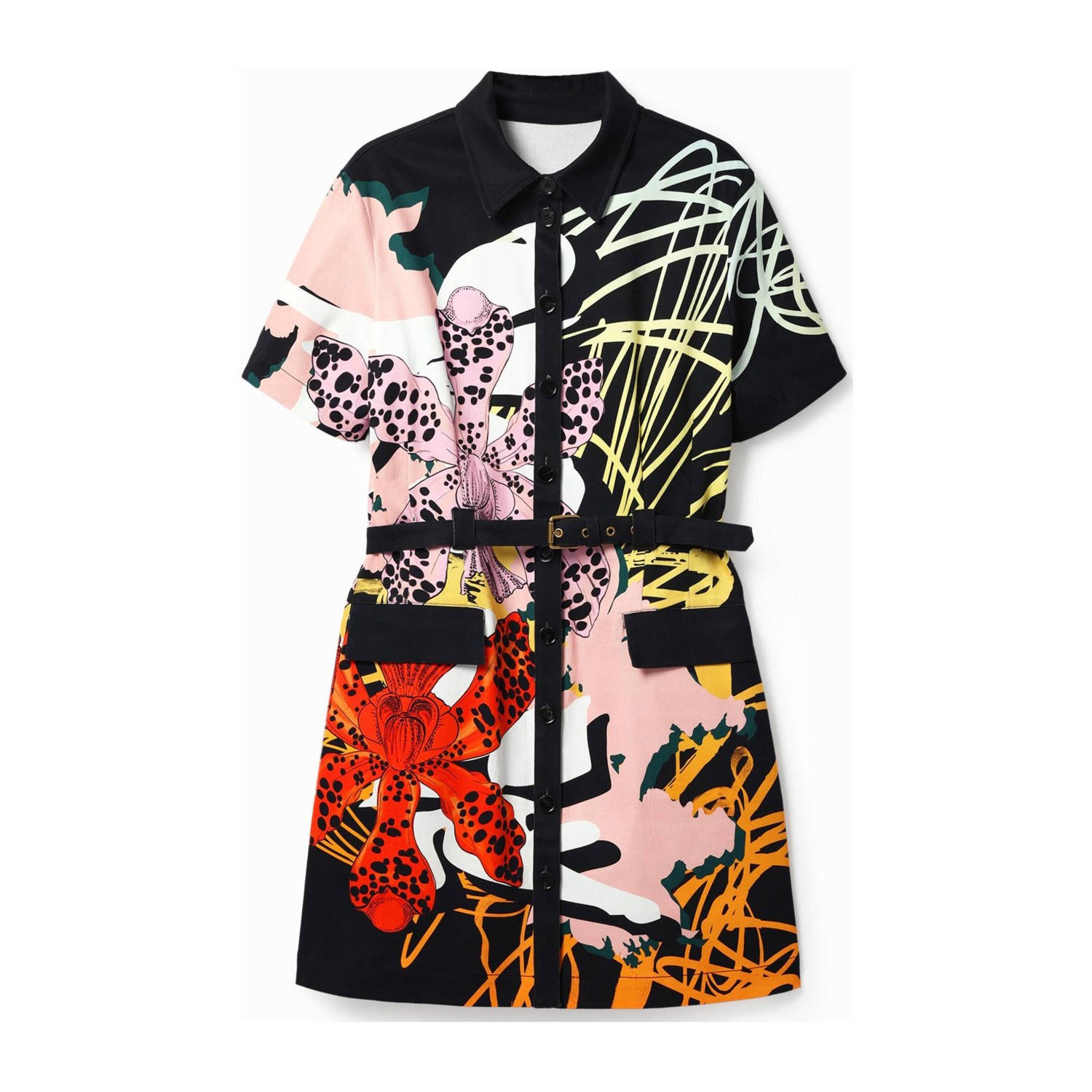 Deze damesjurk van Desigual is gemaakt van viscose en heeft een all over print. Het model beschikt over een knoopsluiting. De jurk met lange mouwen heeft verder een klassieke kraag.details van deze jurk:een ceintuur