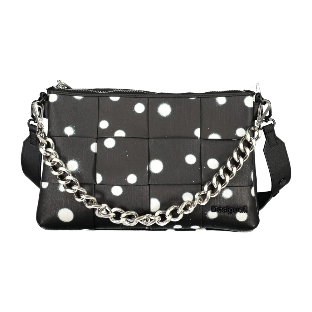 Upgrade je stijl met deze Desigual schoudertas voor vrouwen. Gemaakt van zwart polyethyleen materiaal met een chique polka dot design, deze tas heeft n handvat, een afneembare ketting schouderriem, een verstelbare en afneembare schouderband, twee compartimenten, n centrale zak, n interne zak, contrastdetails en het iconische Desigual-logo.
