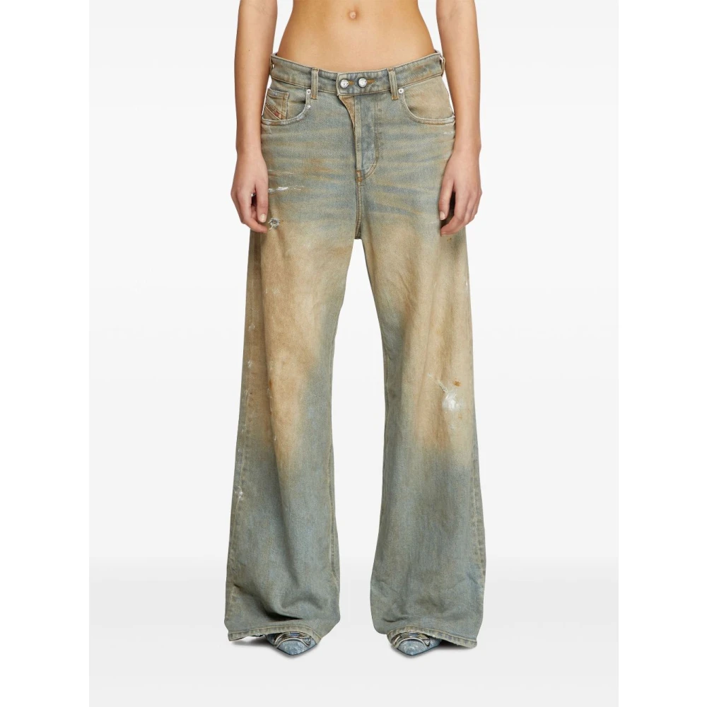 Upgrade je denimcollectie met deze Diesel wijde jeans voor heren. Vervaardigd in een verontruste afwerking, deze mid-rise jeans hebben een topknoop- en ritssluiting, riemlussen, vijf zakken en een voorlogo patch. Gemaakt van 79% katoen en 21% technische blend fabricage. Handwas aanbevolen.