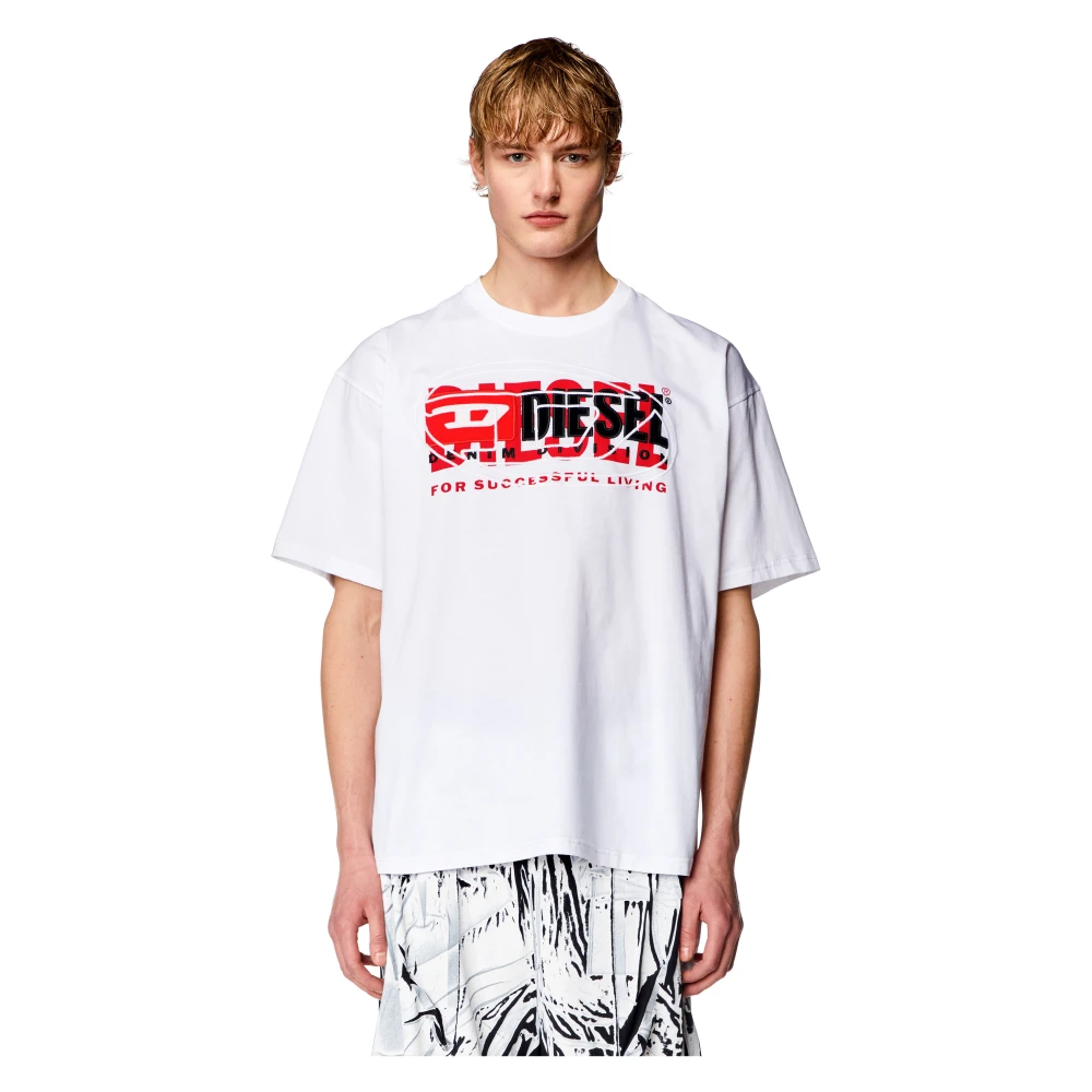Kort T-shirt met korte mouwen voor heren gemaakt van zacht katoenen jersey in een relaxte pasvorm. Drie verschillende logo's zijn in lagen op de borst gerangschikt en combineren print met patches en 3D-borduursel. Door Diesel-katoenproducten te kopen, ondersteun je ons engagement voor de missie van Better Cotton.