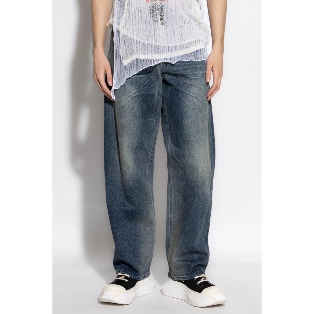 Relaxed-fit jeans met lage taille, laag kruis en wijde pijpen voor een gedurfde uitstraling. De donkerblauwe denim, gemaakt van katoen en hennep, heeft een uniek relifeffect door laserbehandeling en speciale bedrukking, wat textuur en diepte biedt. Knoopsluiting. Details: Ghost Embossed Effect Laserbehandeling en blaasafdrukken Authentieke verouderde afwerking Samenstelling: 79% katoen, 20% hennep, 1% elastaan. Het model is 182 cm lang en draagt maat 32.