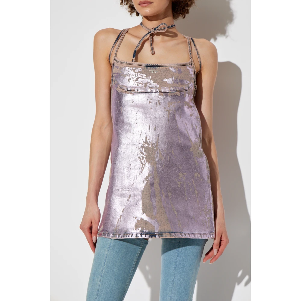 Introducing the exceptional spaghetti strap dress De-Held-Short-S from the exclusive collection by Diesel. This extraordinary creation combines elegance and modern style, making it perfect for special occasions. The dress stands out with its simple, short cut that reaches mid-thigh. Made from a metallic sheen fabric in shades of pink and purple, it catches the eye with a distressed effect on the fabric. The delicate, satin finish adds a subtle glow. The unique character of the dress is highlighted by thin straps that cross elegantly at the back, and a small metal embellishment in the shape of the designers logo at the neckline. The tie collar adds elegance and sophistication. The dress features a side zipper for convenient wear. WHY Should YOU BUY This Product? * Exclusive design from the renowned brand Diesel. * Metallic finish and unique pattern on the fabric. * Elegant details like crossing straps and designer logo embellishment. * Made from high-quality materials: cotton and elastane. * Perfect for special occasions, highlighting modern style and elegance. Model`s Measurements Height: 176cm Bust: 85cm Waist: 60cm Hips: 89cm Model is wearing size: S