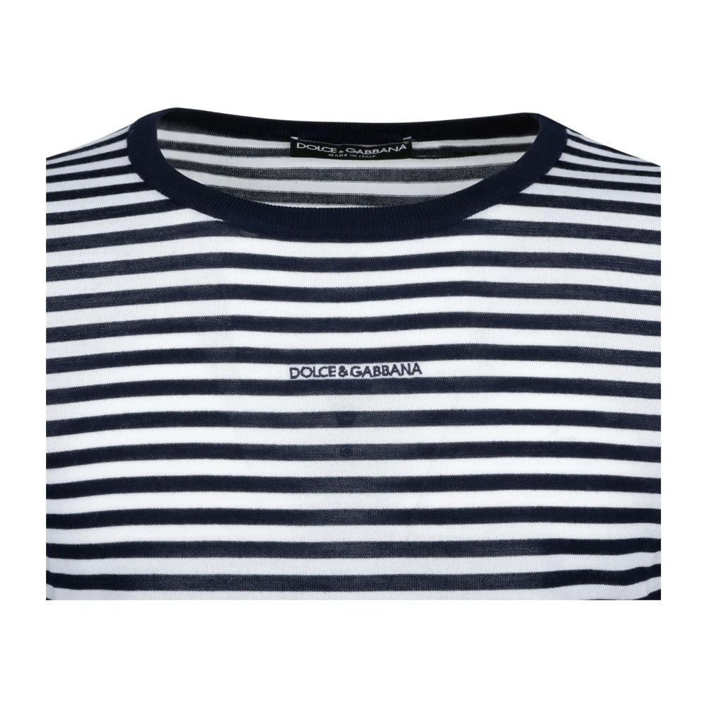 Upgrade je stijl met deze aansluitende Dolce & Gabbana trui met ronde hals. Gemaakt van lichtgewicht zuiver scheerwol, heeft het een gestreept nautisch design, ronde halslijn, geribbelde randen en een geborduurd logo op de borst. Perfect voor de moderne man. Modelhoogte: 187 cm, Maat: IT 48