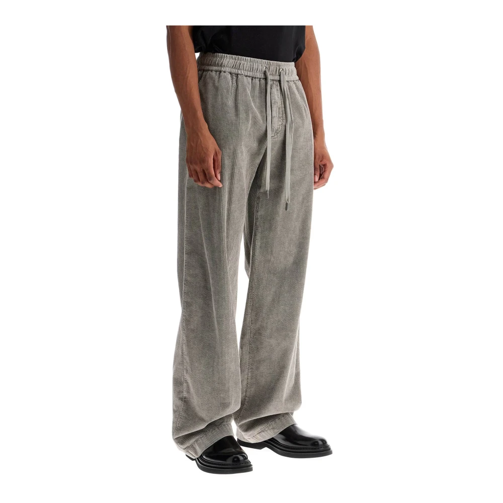 Upgrade je stijl met deze wijde broek van Dolce & Gabbana voor heren. Gemaakt van lichtgewicht stretch katoenen ribfluweel, heeft deze broek een jogger-genspireerd ontwerp met een rechte en relaxte pasvorm, elastische trekkoord taille, schuine zijzakken, achterzakken met knoopsluiting en een verborgen rits aan de voorkant. Het model is 182 cm lang en draagt een IT-maat 48.