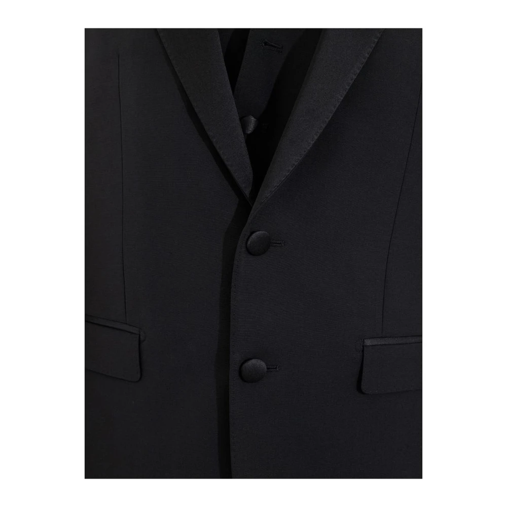 Upgrade je formele garderobe met dit prachtige Dolce & Gabbana driedelige smokingpak. Gemaakt in Itali van een luxueuze mix van wol, zijde en polyester, straalt dit pak elegantie en verfijning uit. Het single-breasted jasje heeft een sluiting met twee knopen, voorzakken en een kleine zak aan de zijkant, allemaal versierd met bedekte satijnen knopen. De smoking-stijl broek heeft vijf zakken, een satijnen streepdetail aan de zijkant en een voorzijde met bedekte knoopsluiting en rits. Maak de look compleet met het vest met satijnen knoopsluiting aan de voorkant, twee voorzakken en een stijlvol mouwloos ontwerp. Dit zwarte pak is een tijdloze klassieker die indruk zal maken bij elke formele gelegenheid.