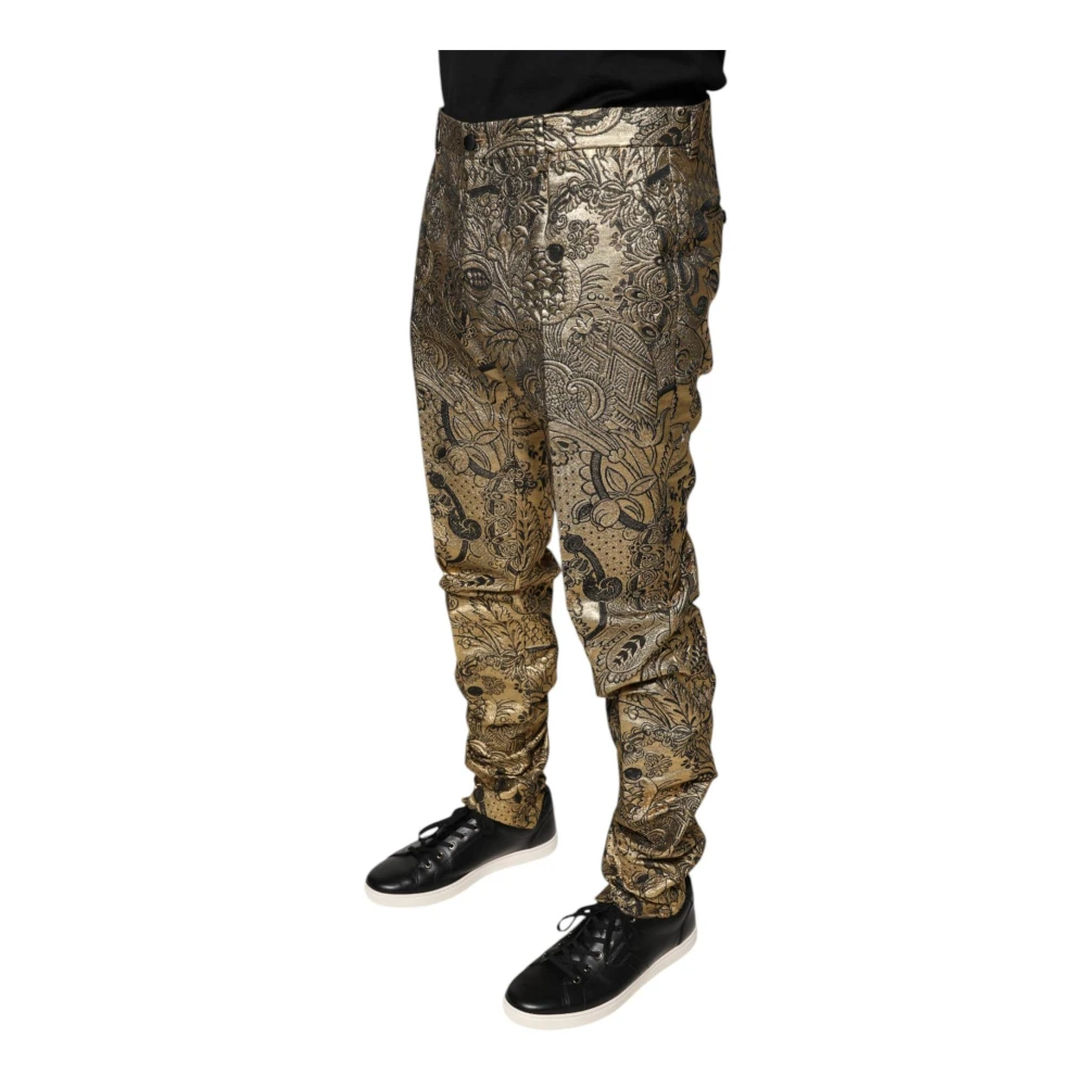 Upgrade je formele look met deze Dolce & Gabbana Gold Floral Jacquard Dress Pants. Gemaakt in Itali, deze slim-fit broek heeft een luxueus gouden jacquard ontwerp met logo details. Gemaakt van een mix van polyester, gemetalliseerd polyester en nylon, met een zijden en viscose voering. Beschikbaar in maat It 52 | XL.