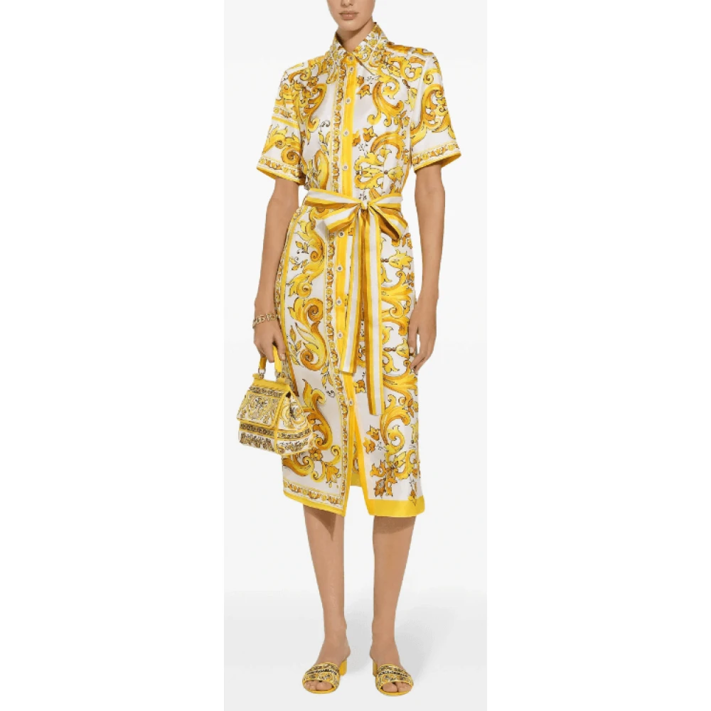 Upgrade je garderobe met deze prachtige Dolce & Gabbana overhemdjurk in ambergeel en wit zijde. Voorzien van een prachtige Majolica-print, klassieke kraag, knoopsluiting aan de voorkant, korte mouwen, afneembare tailleband en een rechte zoom op middellange lengte. Gemaakt van 100% zijde.