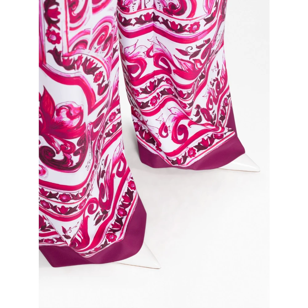 Verrijk je stijl met deze prachtige Majolica-print wijde broek van Dolce & Gabbana. Ontworpen voor de modebewuste vrouw, hebben deze broeken een levendige print in frambozenroze, felroze en melkwit. De hoge taille en stretchstof zorgen voor een comfortabele pasvorm, terwijl de verborgen ritssluiting en knoopsluiting een vleugje verfijning toevoegen. Compleet met twee zij-insteekzakken en een wijde pijp, zijn deze broeken perfect om een statement te maken. Breedte: Corsoeasy.