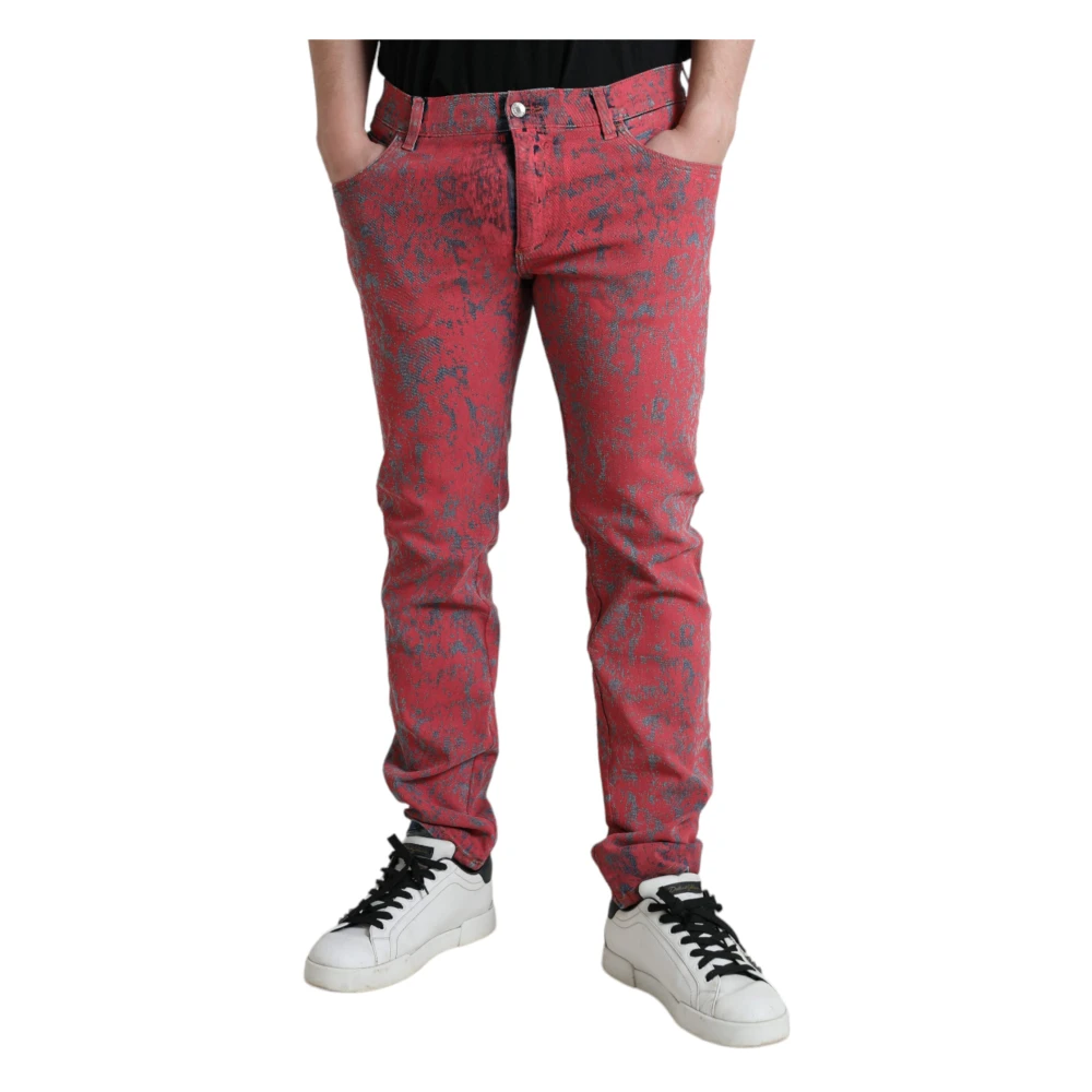 Upgrade je denim look met deze 100% authentieke Dolce & Gabbana skinny jeans voor heren. Gemaakt in Itali, deze rode jeans hebben een trendy tie-dye patroon en slim fit design. Gemaakt van 98% katoen en 2% elastan stretch, bieden deze jeans zowel stijl als comfort. Compleet met rits- en knoopsluiting, evenals logo details, zijn deze jeans een must-have voor elke modebewuste man