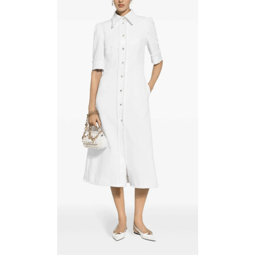 Upgrade je garderobe met deze Dolce & Gabbana overhemdjurk. Gemaakt van een luxueuze zijde-katoenmix tweed in het wit, heeft het een rechte kraag, knoopsluiting aan de voorkant, halflange mouwen en een A-lijn rok met een rechte zoom op middellange lengte. Stofsamenstelling: Buitenkant - Katoen 80%, Vlas 15%, Nylon 5%. Voering - Zijde 92%, Elastaan 8%.