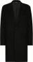 Opstaande revers, knoopsluiting aan de voorkant, lange mouwen, voorklepvakken, midden split aan de achterkant en midi-lengte. Materiaal: scheerwol.