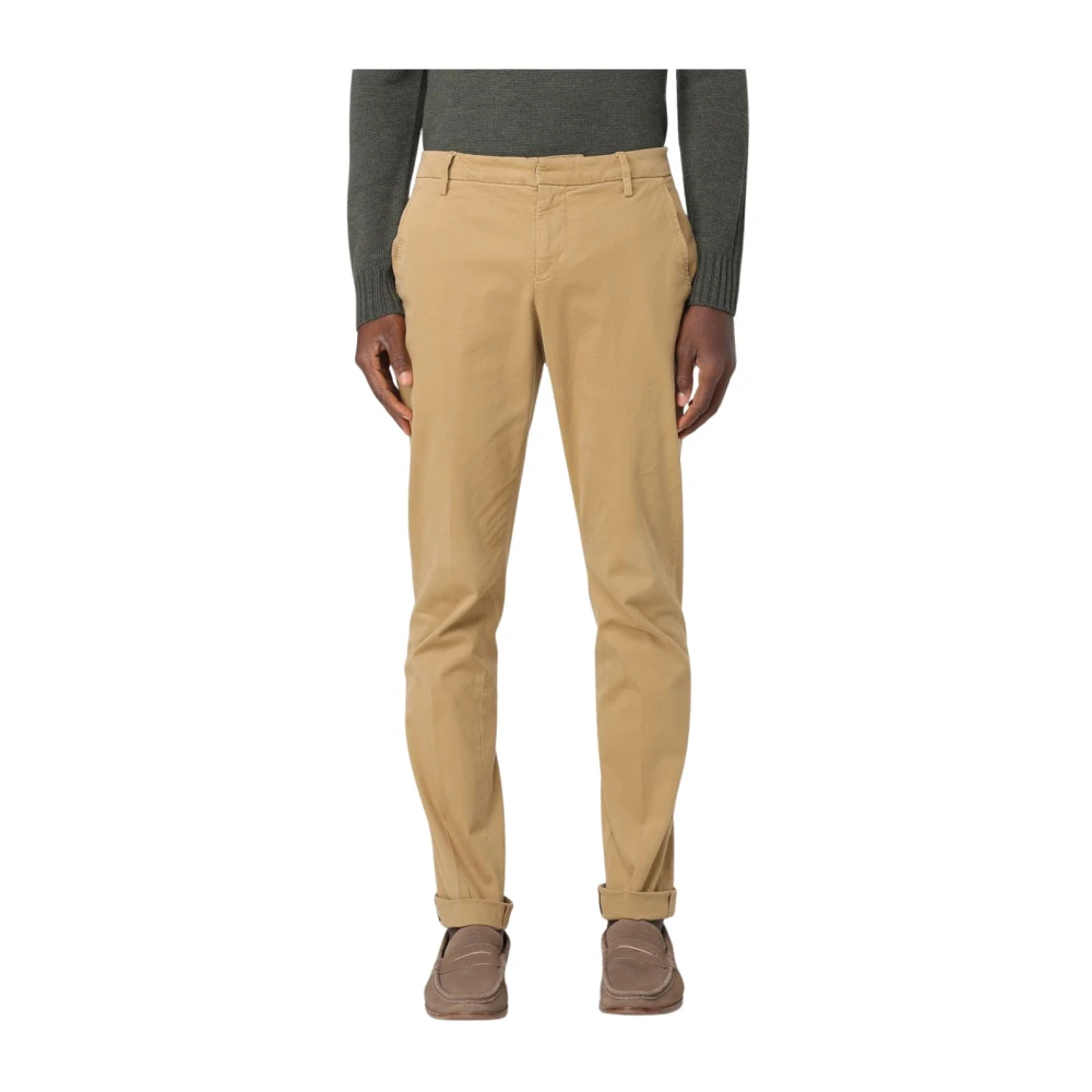 Beige, katoen, geperste vouw, verborgen sluiting aan de voorkant, slim-fit, twee steekzijzakken, twee paspelzakken aan de achterkant en omgevouwen afwerking.