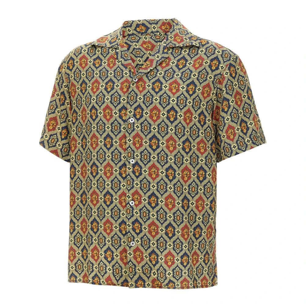 Upgrade je stijl met deze Drole De Monsieur viscose crepe herenoverhemd Le Chemise Ornements. Met een veelkleurig jacquardpatroon in tinten blauw, rood en goudgeel, klassieke kraag, korte mouwen, knoopsluiting met logo en een relaxte pasvorm.
