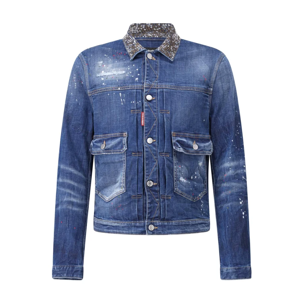 Deze spijkerjas van Dsquared 2, gemaakt van stevig katoen in een verweerde look, heeft gescheurde details en creatieve verfspatten. De rechte en verkorte snit wordt aangevuld met een volledige knoopsluiting en een met studs versierde reverskraag. Opgezette borstzakken met knopen voegen een extra stijlvolle touch toe. Zijn unieke uitstraling maakt het een statement piece voor je alledaagse garderobe.