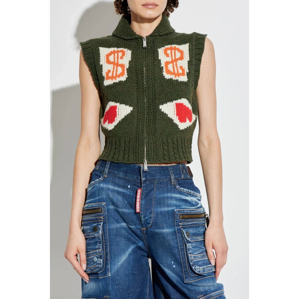Wij presenteren een exclusief vest uit de Dsquared 2-collectie, gecreerd door het visionaire ontwerpersduo, Dan en Dean Caten. Dit buitengewone vest heeft een korte en aansluitende pasvorm die tot aan de taille reikt en elegantie en moderniteit toevoegt. De hoge kraag en volledige metalen rits aan de voorkant bieden zowel comfort als functionaliteit. Gemaakt van dik, gebreid materiaal betovert het vest met zijn textuur, die kan wijzen op handgemaakt vakmanschap. De dominante kleur is groen, met patronen in de vorm van