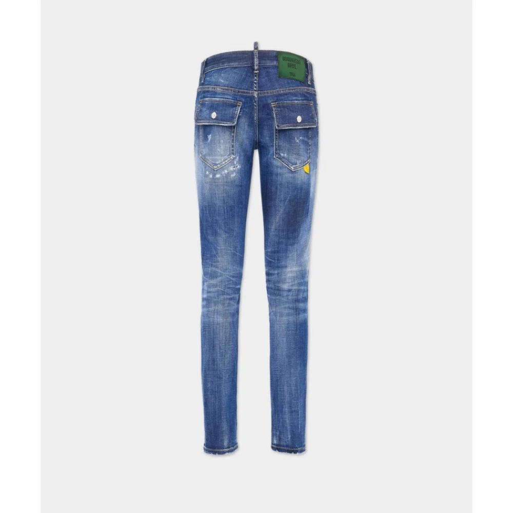 Dsquared 2 Jennifer denim broek voor vrouwen. Knoopsluiting met rood logo op rits. Vijf zakken. Riemlussen. Contraststiksels. Dsq 2 logopatch op linkerbeen. Diverse geplakte scheuren. Achterzakken met klep en knoop. Skinny fit. Samenstelling: 98% Katoen, 2% Elastaan.