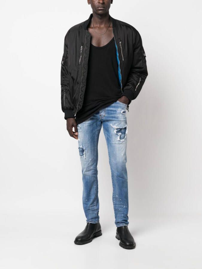 Lichtblauw, katoenmix, logopatch aan de achterkant, gerafeld effect, whisker-effect, verfspetter detail, traditioneel 5-zakkenmodel, riemlussen en skinny-fit.