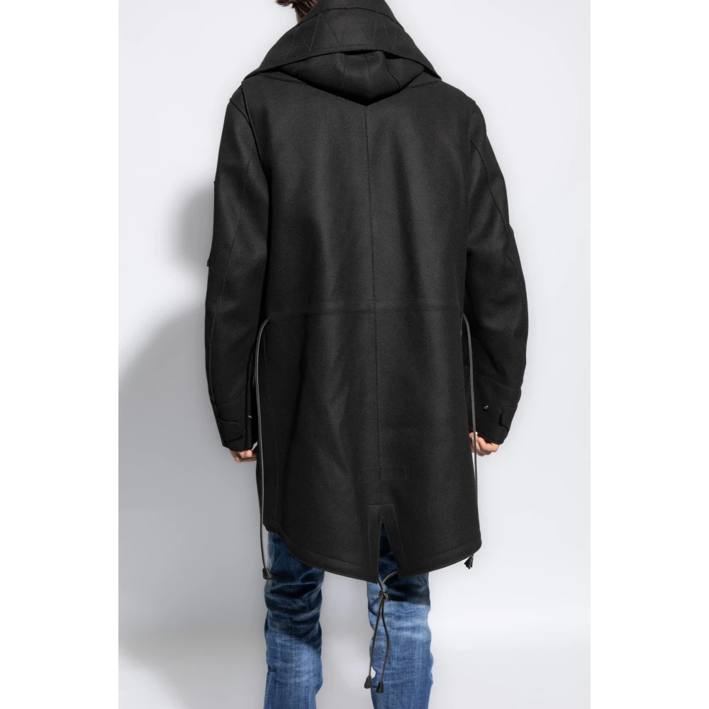 We zijn trots om de Wool Coat van de gerenommeerde ontwerper Dsquared 2 te presenteren, een meesterwerk dat tijdloze elegantie combineert met praktische oplossingen voor veeleisende klanten. De diepe, zwarte tint samen met onderscheidende structurele en decoratieve details tillen elke outfit naar een hoger niveau, zelfs de eenvoudigste. Vervaardigd uit de beste mix van wol, polyamide en elastaan, zorgt deze jas niet alleen voor comfort en warmte op koelere dagen, maar ook voor duurzaamheid en bestendigheid tegen dagelijks gebruik. Het lange model, dat onder de heupen valt, biedt optimale bescherming, terwijl de grote, goed gedefinieerde capuchon fungeert als een stijlvol schild tegen ongunstige weersomstandigheden. Het vermelden waard zijn praktische elementen zoals vijf functionele zakken, waaronder vier met drukknoopsluitingen en n met een rits, die ruimte bieden voor essentile items. De hoofdritssluiting, aangevuld met knopen en extra klittenbandsluitingen bij de kraag, maakt eenvoudige aanpassing aan de silhouet en stijl van dragen mogelijk. Een detail dat deze jas onderscheidt, is de rode