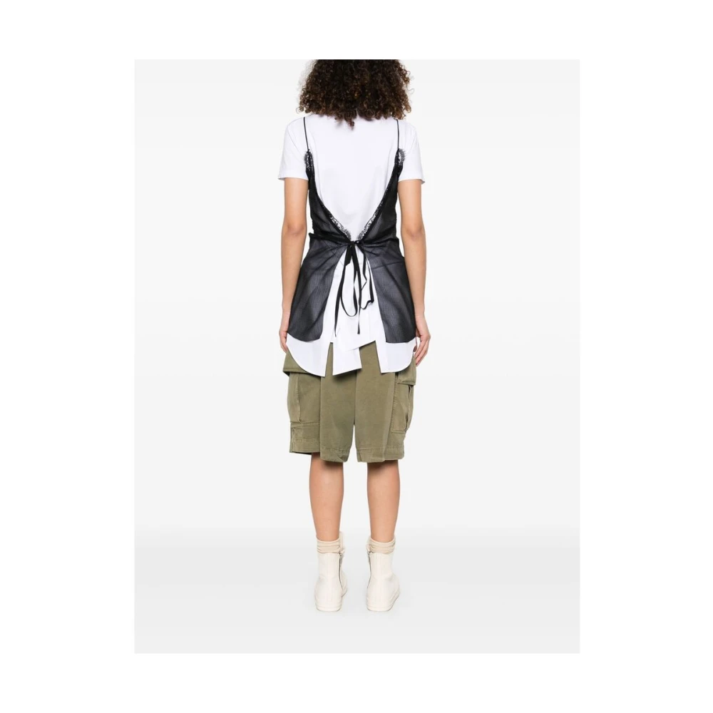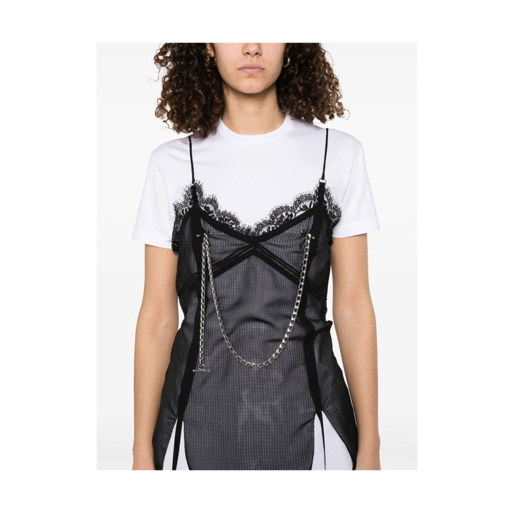 Upgrade je stijl met deze zwarte Dsquared 2 top voor vrouwen met een unieke achterstrik sluiting, kettingdetail, korte mouwen en paneelontwerp.