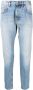 Lichtblauw, katoen, stonewashed, gerafeld effect, riemlussen, knoop- en ritssluiting aan de voorkant, traditioneel 5-zakkenmodel en toelopende pijpen.