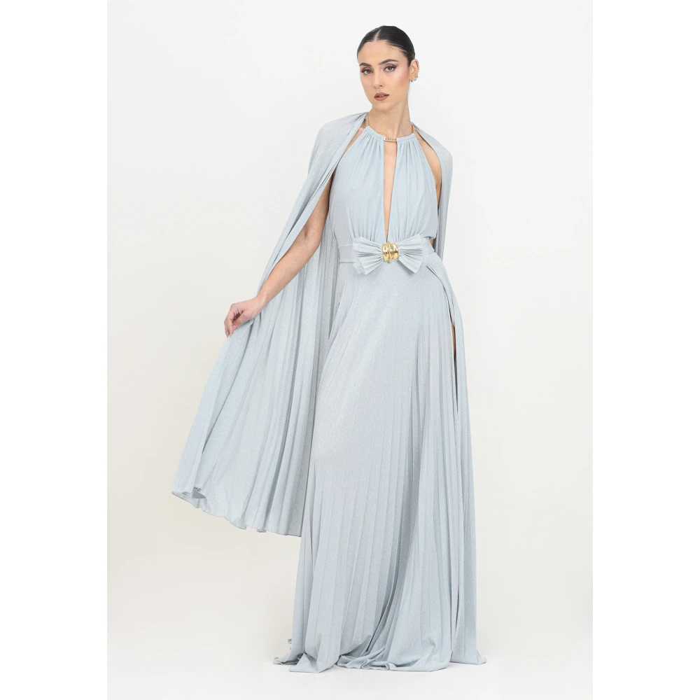 Elegante Elisabetta Franchi lange jurk in blauwe lurex jersey voor vrouwen met geplooide plooien. De jurk heeft een Amerikaanse halslijn met een gouden metalen ketting en een centrale opening. De focus ligt op de cape en de brede splitten die de show stelen. Het gedrapeerde ceintuur met juweeldecoratie, logo en in goudmetaal maakt het stuk compleet. Het model draagt maat 40 en is 170 cm lang. Lente zomer seizoen. Elegante lange blauwe jurk voor vrouwen regular fit lente zomer Abr 1351E2A28.