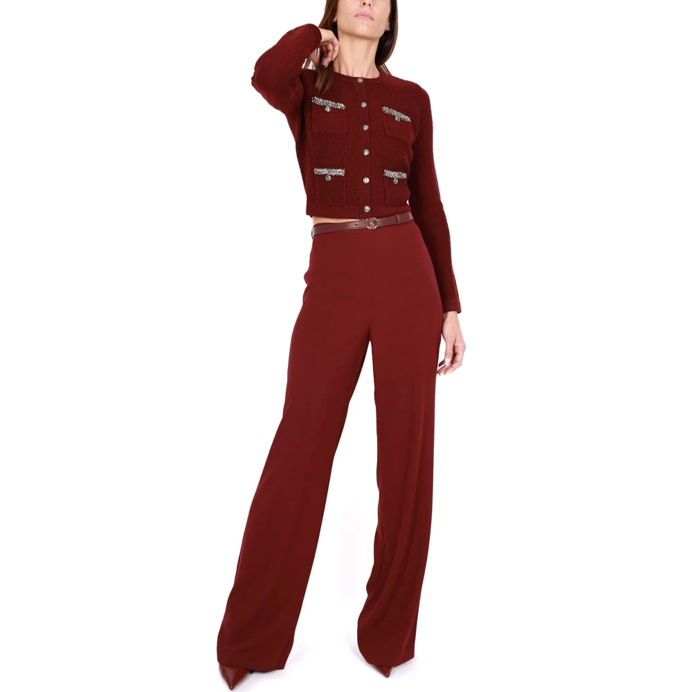 Elisabetta Franchi boucl wollen vest met kraaltjeszakdetails. Regelmatige pasvorm in rouge noir kleur. Gemaakt van 47% wol, 47% acryl, 6% polyamide. Gedragen in maat 40, gemodelleerd door 1, 80 cm lange maat 40 model.
