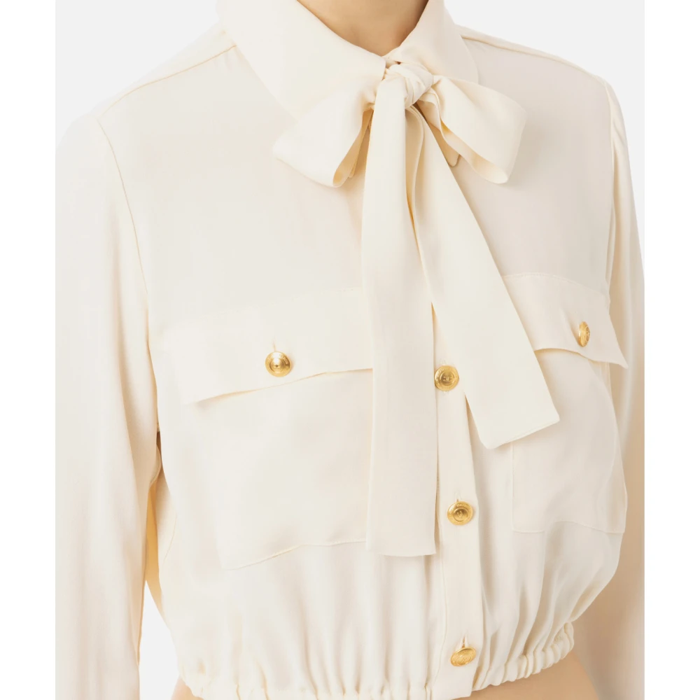 Upgrade je garderobe met deze Elisabetta Franchi cropped georgette blouse met lange mouwen, borstzakken, elastische zoom en een stijlvolle nek sjaal. Gemaakt van 100% viscose, deze slim-fit blouse is versierd met gouden metalen knopen voor een vleugje elegantie.