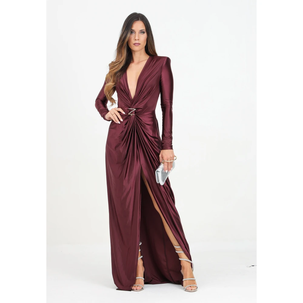 Elegante Elisabetta Franchi lange jurk in bordeaux voor vrouwen met lange mouwen en een split aan de voorkant van de rok. Het kledingstuk heeft een diepe halslijn vastgehouden door een gedrapeerde knoop en een gouden metalen logotoebehoren met strass. Het model draagt maat 38 en is 170 cm lang. Handwas aanbevolen en strijk op gemiddelde temperatuur. Herfst-winter seizoen. Elegante bordeaux lange jurk voor vrouwen, regular fit, herfst-winter Ab 72947E2Cg 3.