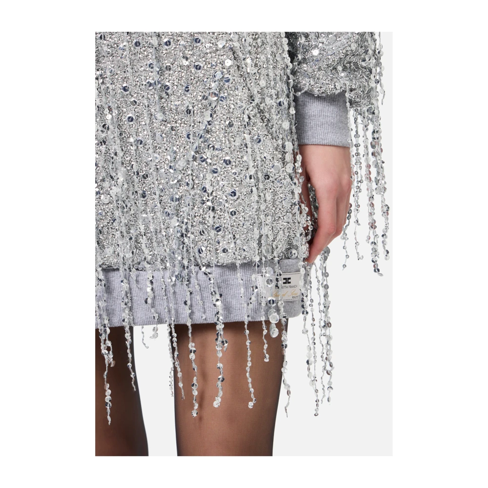Upgrade je feestlook met deze Elisabetta Franchi Mini Jurk in Zilver/Grijs Melange. Gemaakt van 100% katoen, is deze pluche jurk versierd met pailletten franjes, met een capuchon, lange mouwen en zakken. Gemaakt in India. Sku: Ar 56J47E2. Gebreide capuchon voering. Lengte 82 cm voor maat 40 IT. Model is 177 cm lang en draagt maat 40 IT. Samenstelling: 100% katoen. Pasvorm: Oversized.