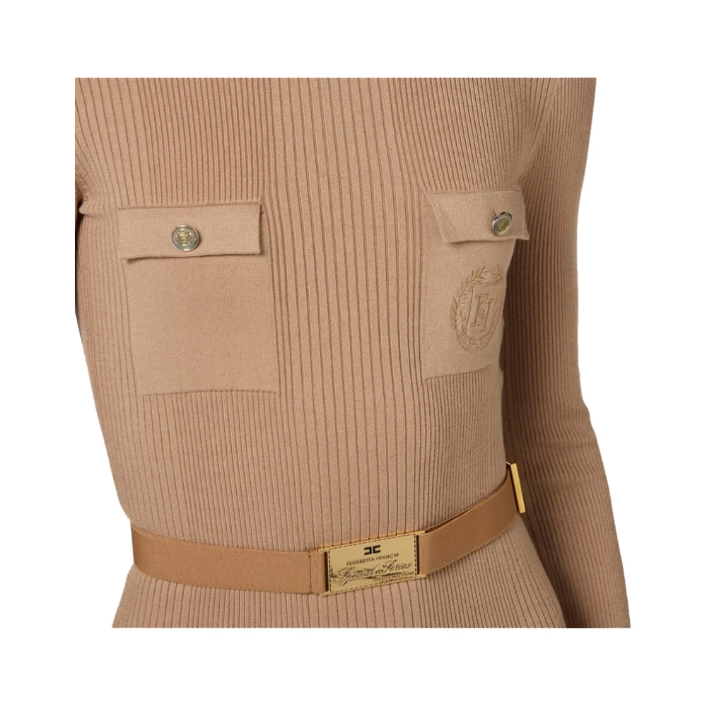 Deze elegante damesjurk van Elisabetta Franchi is perfect voor een verfijnde en vrouwelijke uitstraling. Gemaakt van zacht bruin stof, heeft het een wikkelontwerp met een V-hals en lange mouwen. De getailleerde silhouet benadrukt de vrouwelijke rondingen, terwijl de midi-lengte een vleugje klasse toevoegt. Ideaal voor speciale gelegenheden en elegante avonden.
