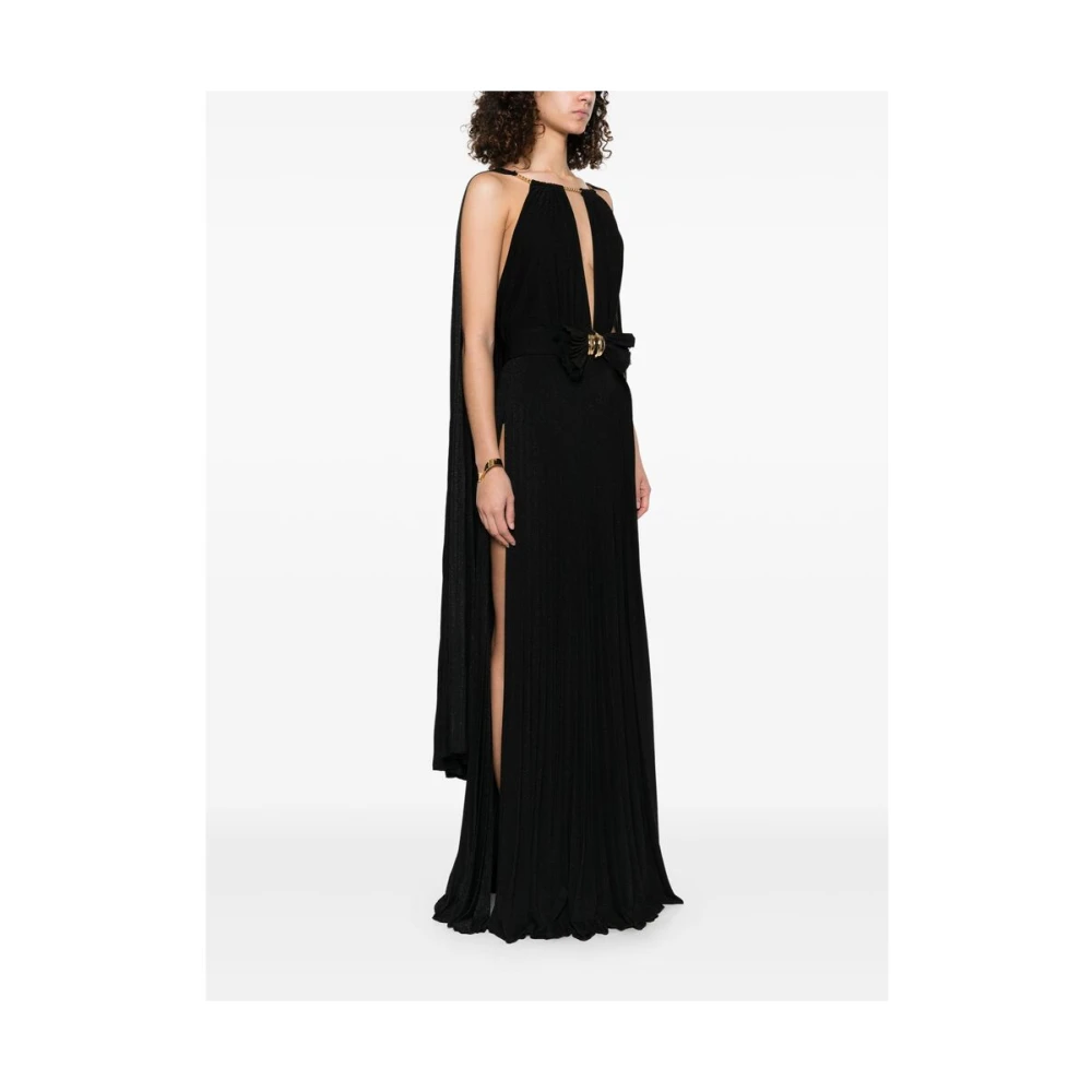 Upgrade je avondlook met deze prachtige Elisabetta Franchi japon in het zwart. Voorzien van een rits aan de achterkant, halternek striksluiting, twee zijdelingse splitzakken en een diepe V-hals.