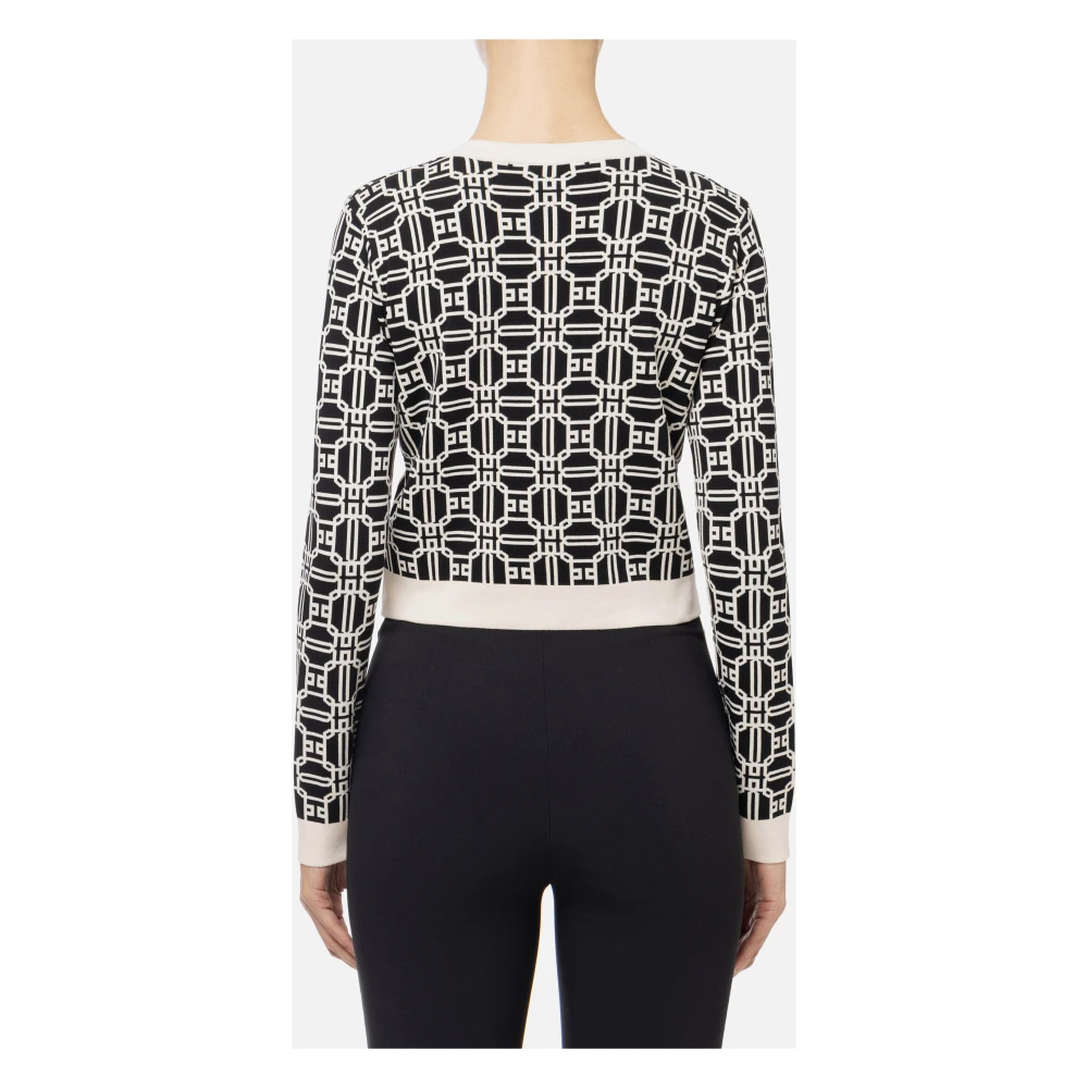 Upgrade je stijl met deze Elisabetta Franchi cropped cardigan in een viscose mix met een logo jacquard print. Het heeft lange mouwen, een ronde halslijn en een ritssluiting aan de voorkant met een gouden metalen trekker met het logo in het midden. De cardigan is afgewerkt met contrasterende kleuraccenten.