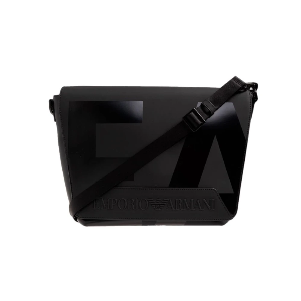 Zwarte schoudertas van Emporio Armani. Gemaakt van rubberachtig materiaal, dit ontwerp sluit met magnetische sluitingen en toont het logo van het merk, een afneembare en verstelbare schouderriem en n interne compartiment met een klittenbandsluiting voor een laptop en een ritsvak. Hoogte: 26 cm Breedte: 40 cm Afmetingen van het model Hoogte: 185 cm Borst: 92 cm Taille: 74 cm Heupen: 91 cm