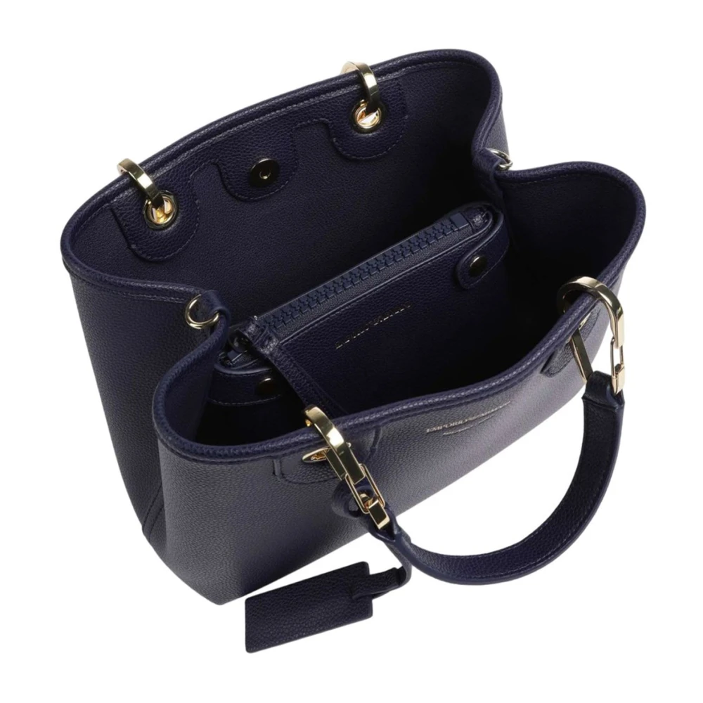 Torba Borsa shopper van Emporio Armani straalt ongevenaarde pracht uit, synoniem voor luxe en functionaliteit. Zijn klassieke, rechthoekige vorm met subtiel afgeronde hoeken, gecombineerd met een buitengewone marineblauwe tint en fijnkorrelige textuur van het materiaal, creert een object van verlangen voor liefhebbers van verfijnde stijl. De afwerking van gouden accenten, inclusief metalen fittingen en elegant bevestigde ringen, spreekt tot het unieke karakter van deze tas. Een zilveren ontwerperlogo met de inscriptie