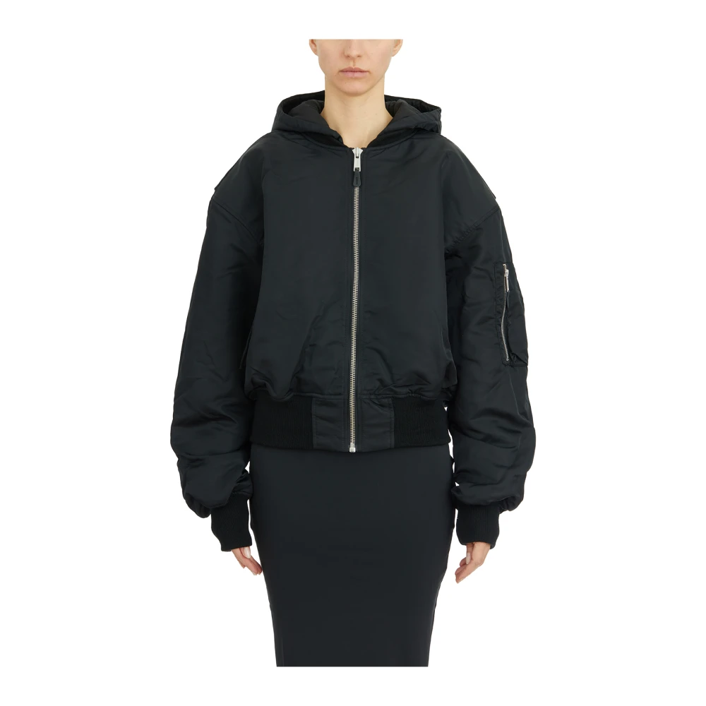 zwart eendendons gewatteerd design baseball kraag ritssluiting aan de voorkant lange mouwen N/A twee ingenaaide zijzakken elastische tailleband met trekkoord binnenvakken met ritssluiting volledige voering rechte zoom cropped Als je dit uniseks item wilt kopen, wees ervan bewust dat het matensysteem voor heren wordt gebruikt.
